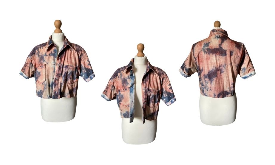 Giacchino in denim, cropped, fantasia tie dye, manica corta.